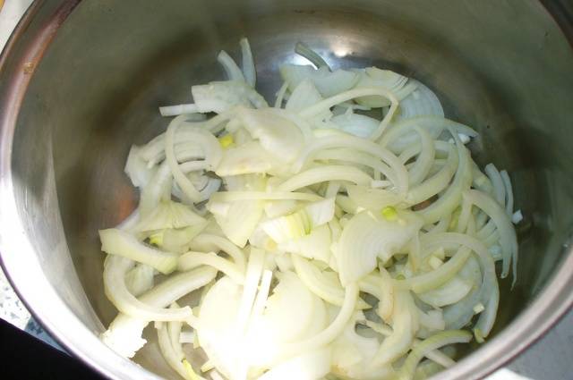 - Los champiñones se retiran en un recipiente aparte, después de lo cual las cebollas se fríen durante 5 minutos.