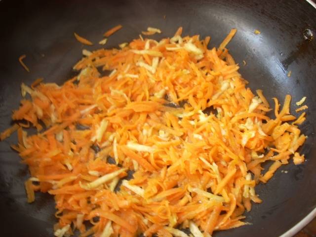 - Se agregan zanahorias a la sartén con cebolla y se agrega sal. Las verduras se cuecen a fuego lento con la tapa cerrada.