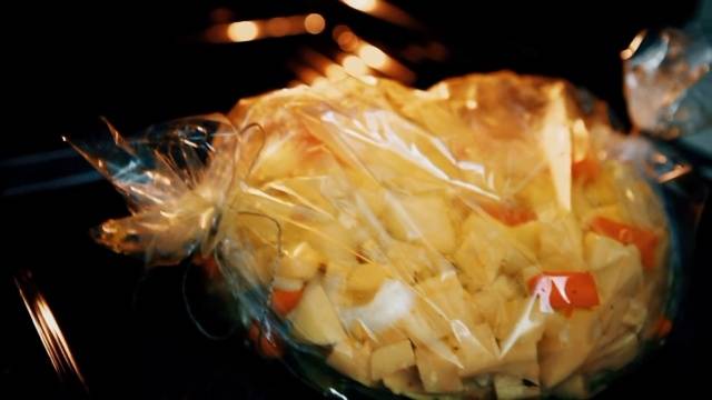 - Las verduras preparadas se colocan en la manga, agregue 2 cucharadas. l. aceites, sal y un poco de pimienta negra molida.