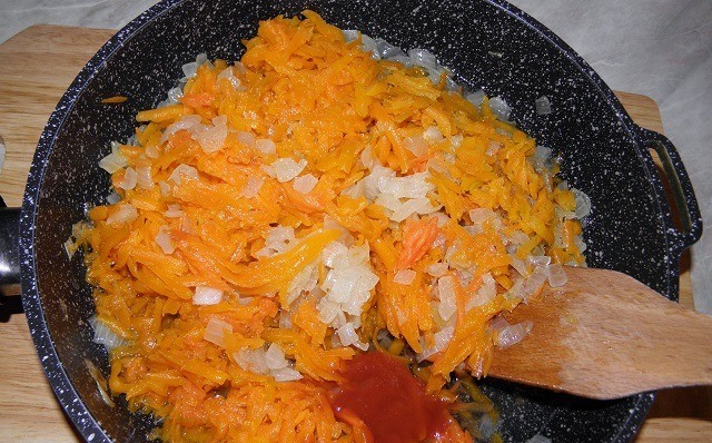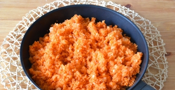 - Al mismo tiempo, las zanahorias peladas se rallan en un rallador mediano y se cuecen en una sartén aparte, agregando un poco de agua para que se ablanden.