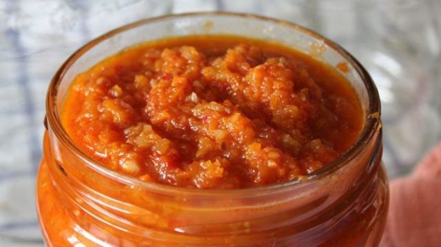 En la receta a continuación, el vinagre no se usa para el invierno, y la sal y el azúcar se agregan exclusivamente a voluntad. Ya que los ingredientes utilizados en esta deliciosa receta tienen propiedades conservantes: cebollas, ajo, pimientos picantes y negros, hojas de laurel.