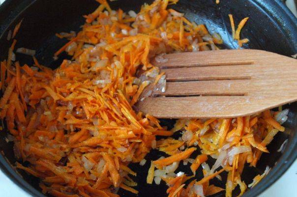 Otras verduras cocidas y picadas (zanahorias, raíces blancas y cebollas) se fríen secuencialmente en la misma sartén donde antes se freían los calabacines. Luego, se les agrega agua y también se cuecen hasta que estén completamente cocidos.