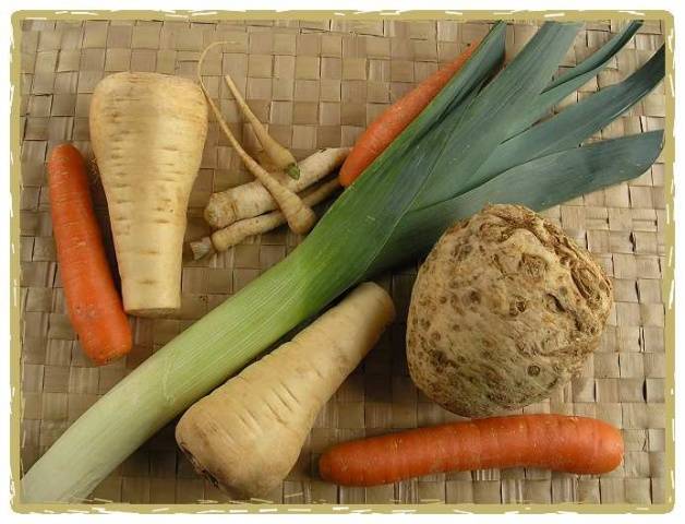 - Raíces blancas -60 g (chirivías -30 g, raíz de perejil y raíz de apio 15 g cada una);