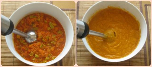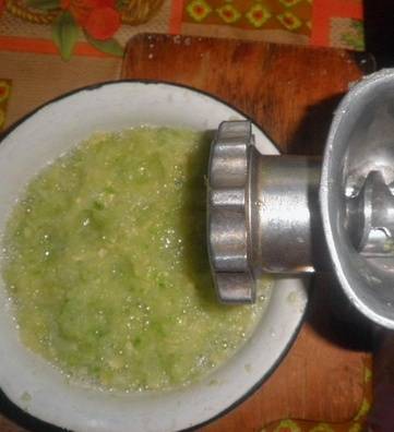 Después del lavado, se pelan las verduras (excepto las cebollas) y las manzanas, se quitan las semillas y se cortan en trozos pequeños y se pasan por una picadora de carne utilizando una rejilla con pequeños agujeros.