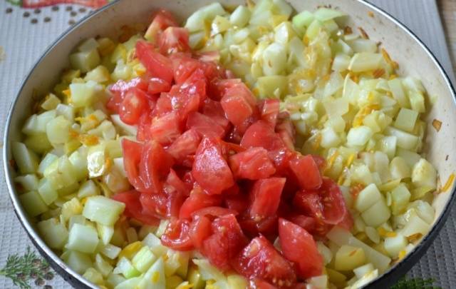 El método de cocinar verduras para cocinar es casi idéntico a la primera opción. La única diferencia es que las verduras no se muelen en una picadora de carne y las cebollas no se cocinan demasiado. Los ingredientes se cortan en cubos e inmediatamente se ponen a hervir a fuego lento.