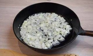 Mientras se cuece el caviar de verduras, picar la cebolla y sofreír hasta que quede ámbar en aceite vegetal.