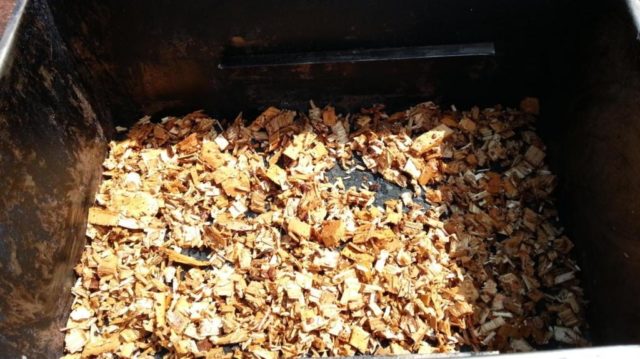 - Colocar chips con aserrín de árboles frutales en el fondo del ahumadero, espesor de capa 2 cm. Para agregar aroma, use varias ramas de enebro.