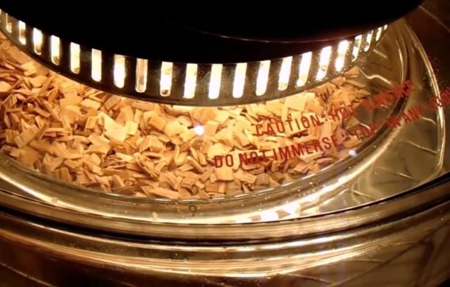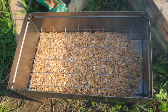 - Coloque virutas de aliso humedecidas con agua y humo líquido en el vaporizador del dispositivo. Luego se coloca en la celosía superior y el producto semiacabado se coloca en el medio.