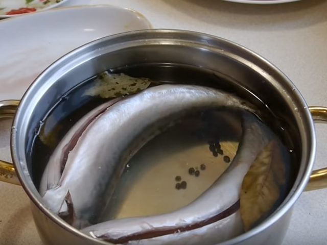 Todos los componentes deben combinarse y hervirse en un recipiente adecuado. El pescado se coloca en la marinada enfriada y se mantiene en el refrigerador durante 6-12 horas bajo una tapa cerrada.