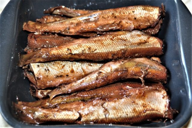 Todos los ingredientes se mezclan en un recipiente pequeño y se prenden fuego. Tan pronto como el líquido hierva, se retira del fuego y se enfría. El pescado se coloca en una bolsa de plástico y se llena con la salmuera preparada. El marinado tarda de 6 a 12 horas.