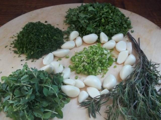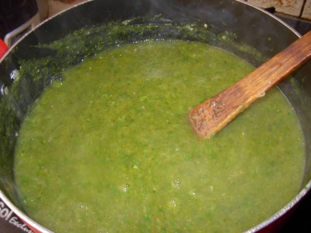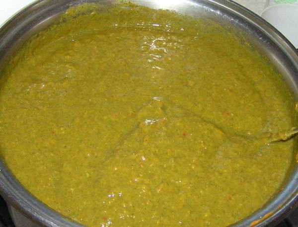 Mientras se cocina la mezcla, mezclar el resto de las hierbas con el ajo y triturar con una licuadora, agregar al puré de ciruelas y guisar a fuego lento durante un cuarto de hora más.