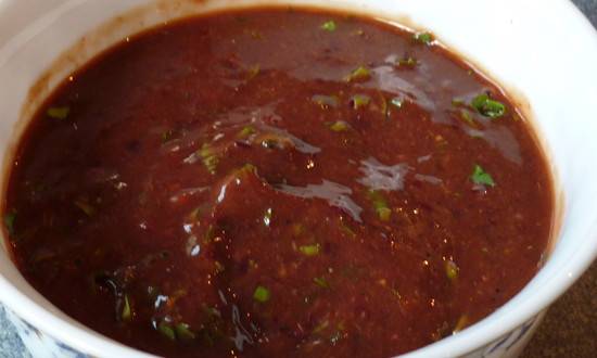 No menos sabrosa es la salsa hecha con frutos rojos maduros de ciruela cereza. Tiene un color rico y único en su tipo que despierta el apetito. La adición de tomates lo hace único.