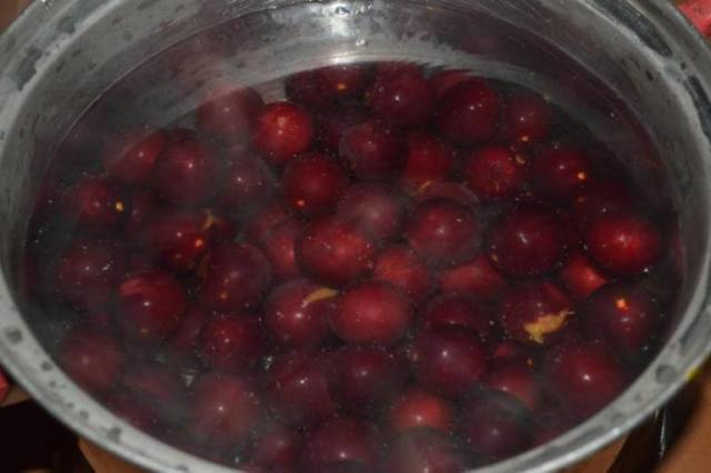 - La ciruela de cereza se lava a fondo, se vierte en una sartén preparada y se vierte con agua (caliente).