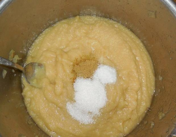 - Después de eso, las manzanas se vierten en una sartén esmaltada y se vierten con agua fría. Déjelos hervir a fuego lento. Luego se retira el recipiente de la estufa y se trituran las manzanas con un machacado. También puedes usar una licuadora.
