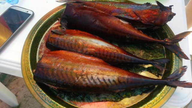 La sal y la pimienta molida son la combinación perfecta para salar pescado frente al ahumadero.