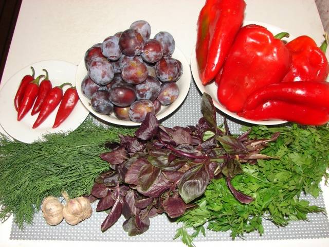 Tome un kilogramo de ciruelas ácidas, manzanas, tomates maduros y pimientos morrones. Además, debe preparar 5 cabezas de ajo, 2 vainas de pimientos picantes, hierbas (albahaca, cilantro, perejil, eneldo 50 gramos cada una), azúcar - 50 gramos y sal - 20 gramos.