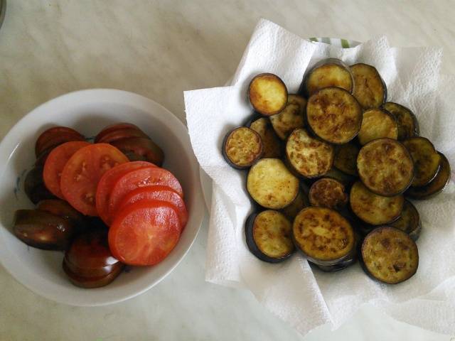 - Pelar la berenjena y cortarla en trozos. Si las verduras producen jugo, debe verterlo.