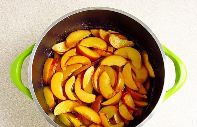 - El jarabe se hierve con agua y azúcar, las frutas preparadas se colocan allí, se cuecen a fuego lento durante aproximadamente un cuarto de hora.