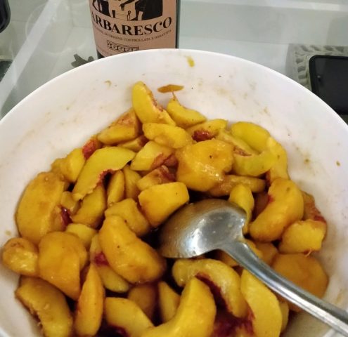 - Los melocotones se pelan de forma probada, se deshuesan y se cortan en rodajas.