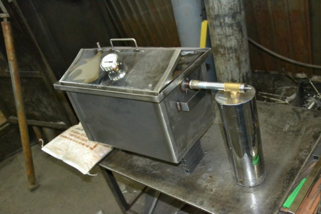 - El ahumadero está cubierto con una tapa con un sello de agua. Le pusieron una chimenea, lo sacaron por la ventana.