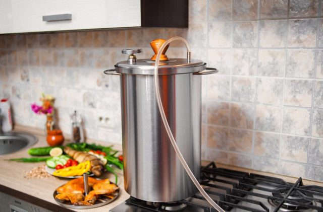 El principio de funcionamiento del dispositivo es simple: la caja de hierro se calienta con fuego, carbón, gas o elementos calefactores especiales. En el fondo del ahumadero, se colocan astillas de madera humedecidas que, cuando aumenta la temperatura, comienzan a humear. La impregnación asegura una cocción rápida y la saturación del pescado con aromas ahumados.