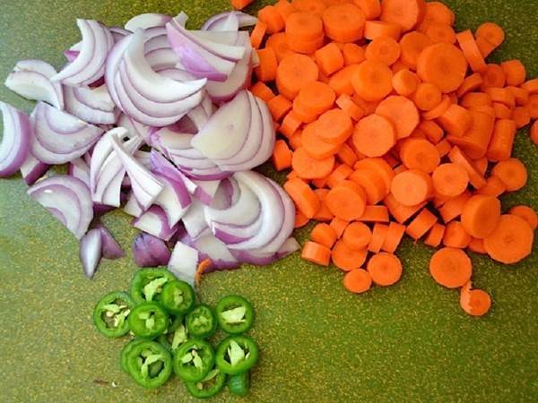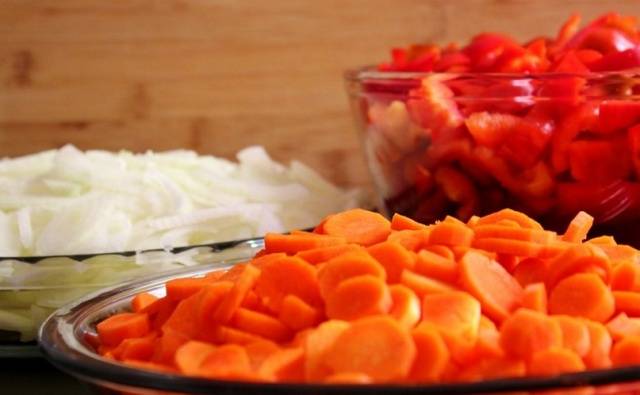 - Primero necesitas preparar verduras. Los pimientos morrones se lavan y se quitan todas las semillas y el corazón. Luego, las verduras se cortan de la manera conveniente (medias anillas, rodajas grandes o tiras).