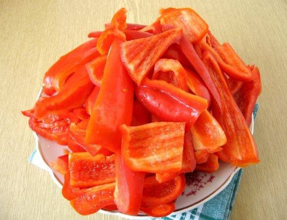 - La pimienta búlgara se lava, se pela de las semillas y se quitan los tallos. Luego se corta en tiras medianas.