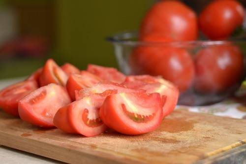 - Los tomates se lavan a fondo con agua corriente y se pelan. Cómo se puede hacer esto se describe arriba. Luego, cada tomate se corta en 4 rodajas.