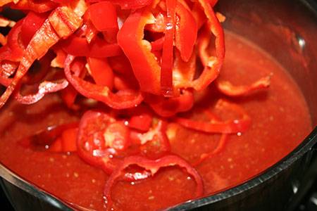- Luego, el aceite de girasol y los tomates rallados se vierten en un recipiente grande. La mezcla se cuece durante 15 minutos. Después de eso, agregue el pimiento picado a la sartén y hierva la masa.
