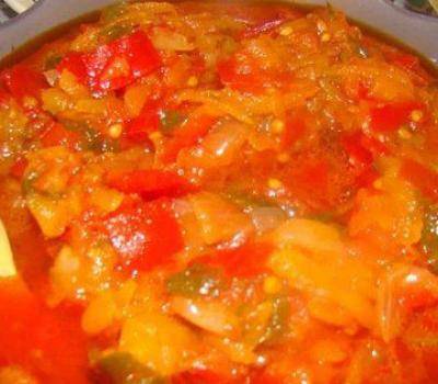 Esta opción pimiento lecho y el jugo se prepara aún más rápido, ya que no es necesario clasificar y pelar cada tomate. Algunas personas generalmente usan pasta de tomate diluida en lugar de jugo. Pero, es mejor preparar una ensalada con tomate o, en casos extremos, con jugo de tomate.