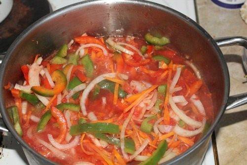 - Luego, todos los ingredientes preparados se transfieren a una cacerola grande y se vierten jugo de tomate... Solo queda vinagre (lo añadiremos al final).