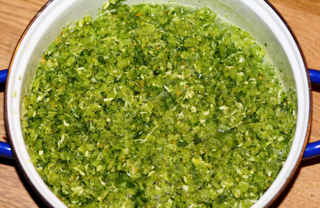Tenga en cuenta que a continuación, en la lista de ingredientes, se indicará el peso de los pimientos ya pelados y triturados con tomates verdes o verdes. A menos que tenga una balanza especial, pesar grumos y líquidos puede ser un verdadero desafío. Proceder de la siguiente: