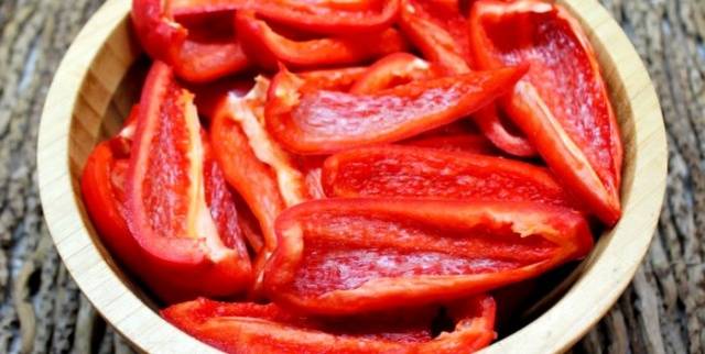 Para el lecho, la receta prevé el uso de pimientos dulces carnosos de paredes gruesas. Córtelo en trozos de aproximadamente 1-1.5 cm por 6-7 cm. Pero estos pimientos son caros, por supuesto, si desea ahorrar dinero o cultivar variedades búlgaras comunes, puede usar frutas de cualquier tamaño. En este caso, agranda las piezas.