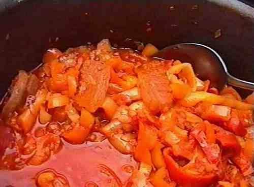 En la siguiente etapa, el pimiento se corta en aros o tiras. Se verá especialmente hermoso en lecho cocido en olla de cocción lenta, pimientos dulces de diferentes colores: rojo, naranja, amarillo, negro.