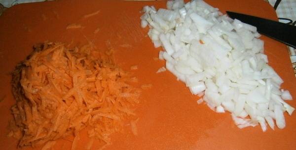 La cebolla se corta en aros o medias anillas. Las verduras se cortan finamente con un cuchillo.