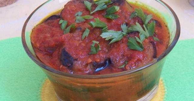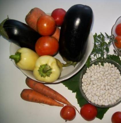 Los frijoles se remojan y se hierven como en la receta anterior. Los tomates también se muelen con una licuadora de cocina o se trituran. Se lavan las berenjenas y se quitan los tallos. Luego se cortan de cualquier manera. Lo principal es que los cubos o rodajas no miden más de 1 cm de ancho. Ahora espolvorear con sal y dejar actuar la sal durante 30 minutos.