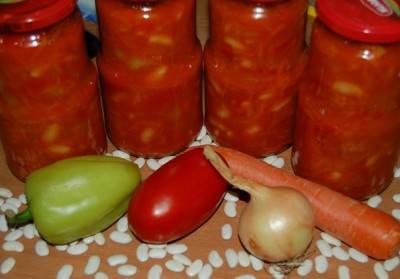 Es hora de empezar a cocinar. En primer lugar se pone al fuego una mezcla de masa de tomate, pimientos picantes, aceite de girasol, ajo, azúcar granulada y sal. Todo esto debe hervir durante 3 minutos, después de lo cual se agregan todas las verduras restantes a la ensalada. De esta forma, la pieza de trabajo se cuece durante al menos 25 minutos a fuego lento. Ahora es el momento de agregar los frijoles. Con él, la ensalada debe cocinarse por otros 5 minutos. Luego se vierte vinagre de mesa en la masa y se apaga el fuego.