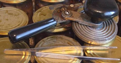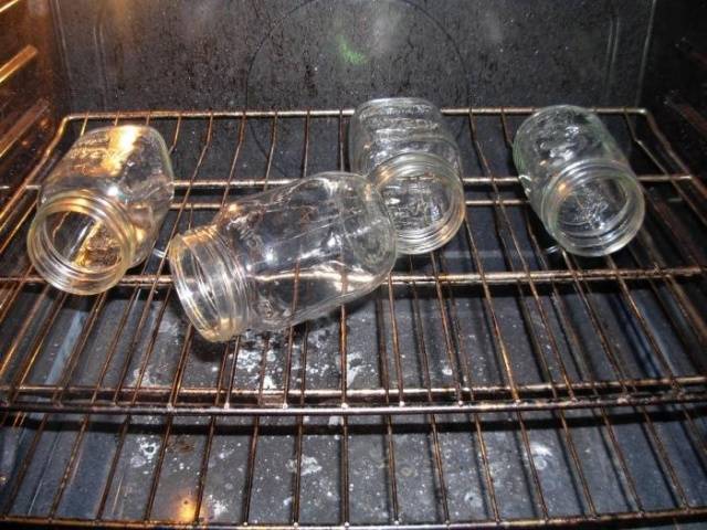 - Preparación de platos para conservas. Los bancos y las tapas están bien lavados y esterilizados, las latas están en el horno, las tapas están hervidas. A una temperatura de 150 grados, mantenga los platos en el horno durante 10 minutos.