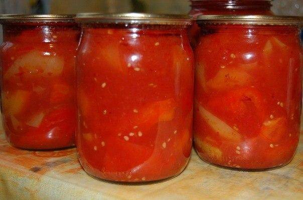 Puede prescindir de la esterilización, pero luego el tiempo de cocción del lecho debe aumentarse a 25-30 minutos. Si los tomates están muy dulces, tendrás que agregar 2 cucharadas a la mezcla de verduras. cucharadas de vinagre al 9%. - Los frascos están sellados herméticamente.