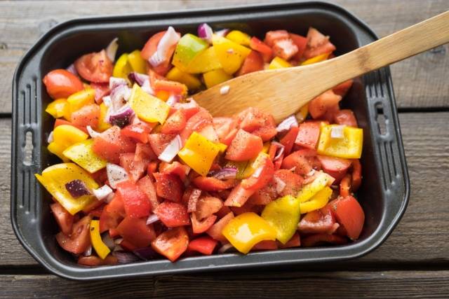 Sofreír las cebollas en aceite de oliva en un bol de fondo grueso. Agregue pimiento cortado en cuadrados y tomates picados, cocine a fuego lento, cubriendo con una tapa durante aproximadamente media hora. Pimienta el plato terminado, sal y sazone con azúcar.