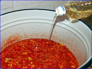 Sazone la masa hervida con azúcar, mantequilla, sal, agregue ajo finamente picado y pimiento picante. Revuelva, cocine por 5-7 minutos. Mientras hierve la masa de tomate, cortar el pimiento morrón y la cebolla en rodajas, tres zanahorias en un rallador. Agregue verduras a la masa de tomate, cocine por unos 40 minutos. Si te gustan las hierbas picantes, en esta etapa puedes agregarlas, habiéndolas previamente picadas finamente. El sabor del lecho solo se beneficiará de esto.