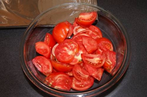 - Cortamos verduras. Corte los tomates pequeños en cuartos, los tomates más grandes en trozos más pequeños.