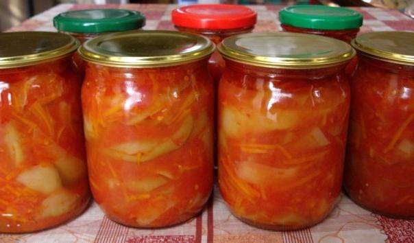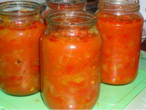 Agregue las zanahorias ralladas a la cebolla y cocine a fuego lento durante 10 minutos. Agregue pimiento dulce cortado en tiras y ajo picado, especias. Vierta las verduras con la pasta de tomate diluida, cocine a fuego lento durante unos 40 minutos. Agregue vinagre 5 minutos antes de cocinar. Lo empacamos inmediatamente en un recipiente estéril preparado con anticipación y lo cerramos herméticamente.