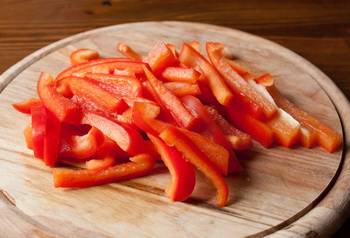 - Corta los pimientos a lo largo en cuartos, corta cada parte en tiras longitudinales.