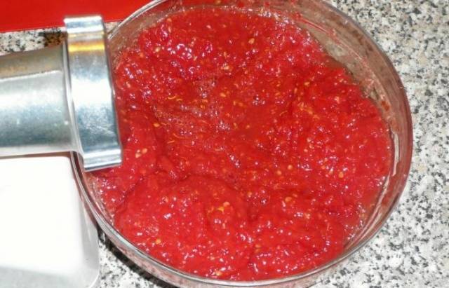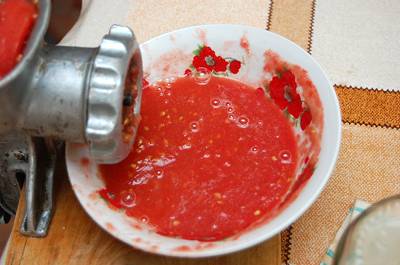 Los trozos de pimiento no deben ser pequeños, de lo contrario perderán su forma durante la cocción. - Pasamos los tomates por una picadora de carne.