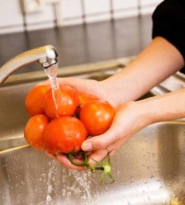 - Lavan verduras. Las semillas se retiran del pimiento, el lugar de unión del tallo se corta de los tomates.