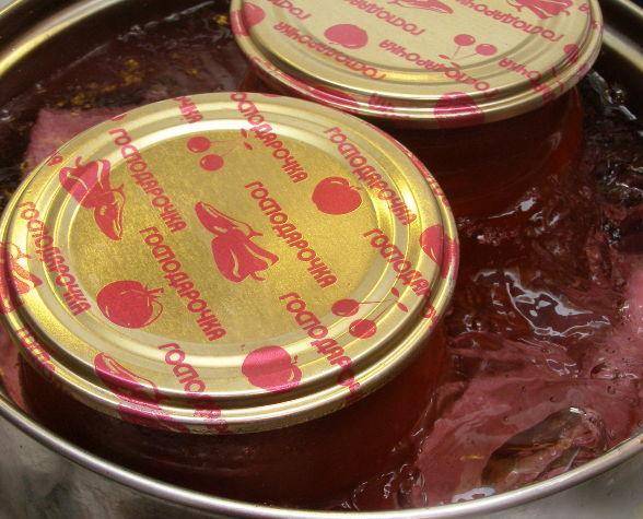 La temperatura del agua en la olla donde se colocan los frascos debe ser la misma que la temperatura de su contenido. Los frascos de medio litro se esterilizan durante media hora y los frascos de un litro, 40 minutos.