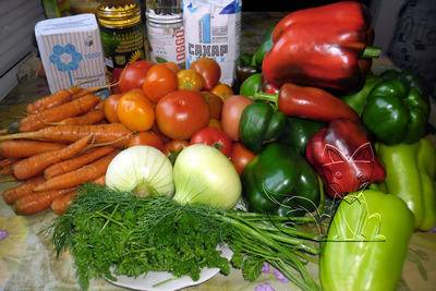 Elija los tomates maduros y más dulces para su preparación. Es mejor tomar pimientos rojos y verdes en una proporción de 3 a 1. También puedes tomar frutas de diferentes colores, entonces la comida enlatada resultará elegante.