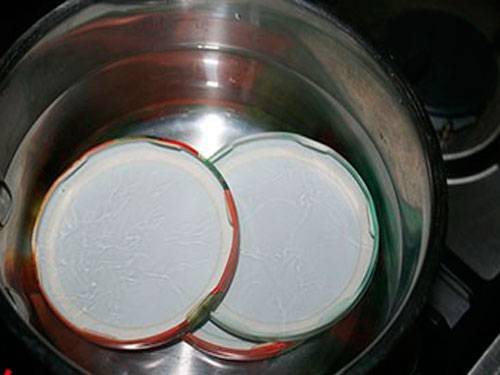 Hierva las tapas durante 10-15 minutos. - Empacamos el lecho en frascos calientes y, cubriéndolo con una tapa, lo ponemos al baño maría para esterilizarlo.