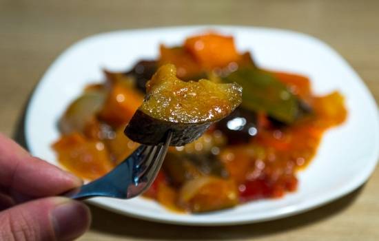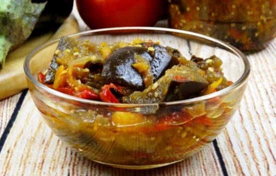 La ensalada se vuelve a hervir y se añaden ajo y berenjena. La mezcla se cuece a fuego lento durante 30 minutos. Unos minutos antes de que esté completamente listo, debe verter vinagre de mesa en el lecho y mezclar. Cuando la masa vuelve a hervir, se apaga y se vierte en recipientes esterilizados. Luego, las latas se voltean y se cubren con una manta tibia. De esta forma, la ensalada debe reposar durante al menos un día. Luego, el lecho se traslada a una cámara frigorífica para su posterior almacenamiento.